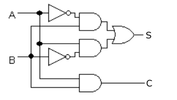 半加算器とは「加算器の一つで、2進数の一桁の加算を行なう回路」 半加算器は、繰り上がりを考慮しない2進数1桁の加算と、1桁の繰り上がりを出力することができます。 半加算器だけでは2進数の一桁しか計算できず、下の桁からの繰り上がりも処理できないが、半加算器を二つ組み合わせると全加算器となり、下の桁からの繰り上がりを考慮した二進数の一桁の加算が実現されるようになります。 また、8桁(8ビット)の加算器を実現するには、全加算器を8個またき、半加算器を16個を用意すれば実現できます。 二つの入力「入力A」「入力B」より、1桁の答え「S」と1桁の繰り上がり「C」を出力します。 下記より、答え(S)は入力(A・B)の「排他的論理和(XOR)」で、繰り上がり(C)は入力(A・B)の「論理積(AND)」となります。 ![]() 半加算器は、AND回路、OR回路、NOT回路より構成されます。