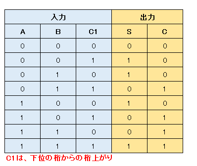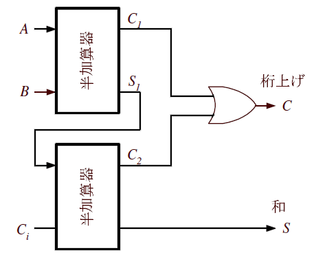 全加算器とは、「2個の半加算器と1個のOR回路から構成され、繰り上がりを考慮した加算器」 全加算器を必要な桁数分を組み合わせれば、任意桁の2進数の加算を実現できることになります。 1つの全加算器は、2つの半加算器と一つのOR回路から構成されます。つまり、3入力(演算A・B・繰り上がりC1)で、2出力(演算結果のS・繰り上がりC)となります。 ![]() 全加算器は、2つの半加算器とOR回路より構成されます。