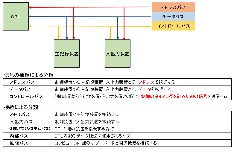 コンピュータの各装置の間で「データをやり取りするための伝送路」を「バス」といいます。バスは、各装置をつないでいる「信号線の束」です。以下の種類があります。
