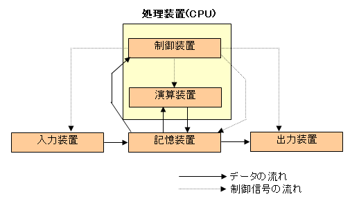 ●入力装置 データをコンピュータへ取り込む機能。キーボート、マウス、スキャナなど。 ●記憶装置 入力装置から取り込まれたデータを記憶する機能。主記憶装置(メインメモリ)・キャッシュメモリと補助記憶装置(磁気ディスク・DVDなど)があります。 ●制御装置 主記憶装置に格納されている各命令に従って他の装置を制御する機能。 ●演算装置 データ処理の演算(算術演算・論理演算)を行う。主記憶からデータを読み込み、結果を再び返します。 ●出力装置 主記憶装置のデータを外部の装置へ出力する機能。デイスプレイやプリンタなど。 |
