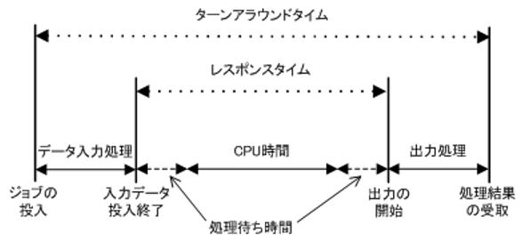 | システムの性能評価には以下のものがあります。 ●ターンアラウンドタイム バッチ処理でジョブを投入してからすべての処理結果を受取るまでの時間。 処理待ち時間 + CPU時間 + 入出力時間 ●レスポンスタイム(応答時間) オンライン処理で、入力装置から入力が完了して出力装置へ出力が開始されるまでの時間。 処理待ち時間 + CPU時間