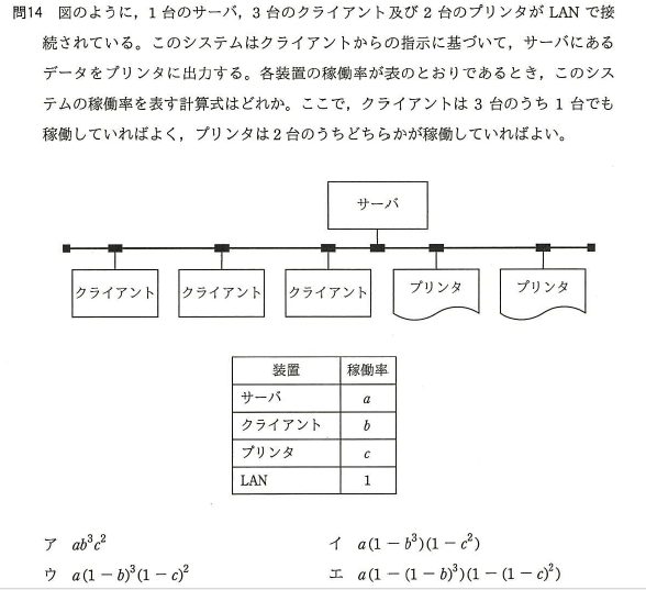 ・サーバの稼働率 a ・3台クライアントの稼働率はどれかひとつで良いため 1-(1-b)3 ・2台プリンタの稼働率はどれかひとつで良いため 1-(1-c)2 上記の3つの直列システムのため a(1-(1-b)3)(1-(1-c)2) となります。エが正解。 過去問題 ある装置の100日間の障害記録を調査したところ、障害が4回発生し、それぞれの故障時間は、60分、180分、140分及び220分であった。この装置の稼働率はどれか。ここで、この装置の毎日の稼動時間は10時間とする。 (解説) 稼働率は、(稼動時間-故障時間)÷稼動時間である。従って、 (10×100-(60+180+140+220)÷60)÷(10×100)=0.99 |