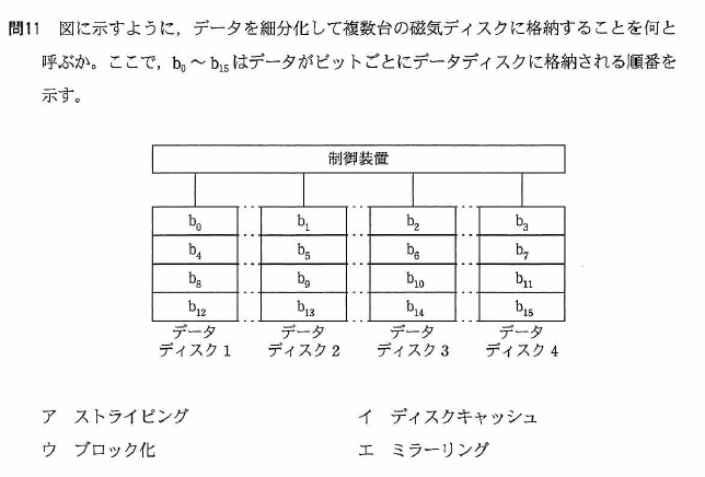 データを複数の磁気ディスクに分散して格納しています。これを「ストライピング」といいます。RAID0に該当します。 |