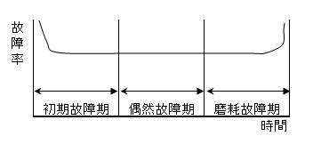 装置の使い始めの故障で時間と共に減っていきます。 ●偶然故障期 装置の安定時期で、故障は余り発生しません。 ●磨耗故障期 ある程度の時間が経過した時に故障が増えていきます。 |