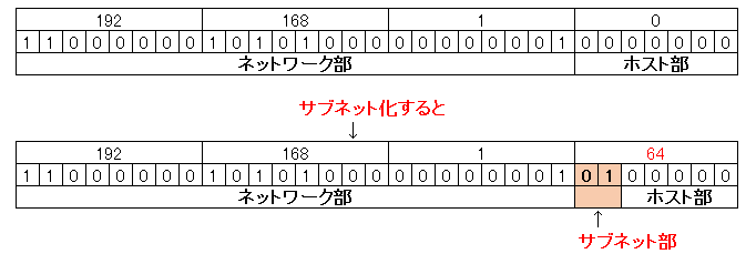1つのネットワークを複数のネットワークへ分割することを「サブネット化」といいます。具体的には、「ホスト部の先頭の数ビットをサブネット部」とします。 例