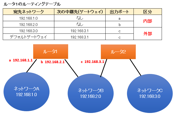 IPでは、いくつかのルータを経由して、目的のコンピュータが所属するネットワークを特定します。この時、ルータが最適に経路を示しています。ルータには、地図に該当する「ルーティングテーブル」を持っています。これを頼りに適切なルートが決定されます。