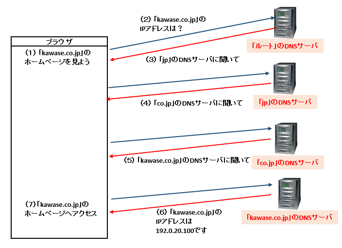 ・ルートDNSサーバーに、「『kawase.co.jp』のIPアドレスは?」と聞くと(②)、 ・「kawase.co.jp」の最後の部分、「.jp」の部分に着目して、「『.jp』のDNSサーバーに聞いて」といった返事が返ってきます(③)。 ・ルートサーバーは、トップレベルドメインごとのDNSサーバーがどこにあるか、という情報だけをもっているのです。 ・今度は「.jp」のDNSサーバーに、「『kawase.co.jp』のIPアドレスは?」と、さきほどと同じ問い合わせをおこないます。すると「.jp」のDNSサーバーは、「『co.jp』のDNSサーバーに聞いて」といった返事だけを返します(④)。 ・「.jp」のDNSサーバーも、最終的なIPアドレスの情報ではなく、それをもっているであろうDNSサーバーの場所だけを示す、というわけです。 ・今度は「co.jp」のDNSサーバーに、「『kawase.co.jp』のIPアドレスは?」と、さきほどと同じ問い合わせをおこないます。すると「co.jp」のDNSサーバーは、「『kawase.co.jp』のDNSサーバーに聞いて」といった返事だけを返します(⑤)。 ・「co.jp」のDNSサーバーも、最終的なIPアドレスの情報ではなく、それをもっているであろうDNSサーバーの場所だけを示す、というわけです。 ・今度は「kawase.co.jp」のDNSサーバーに「『kawase.co.jp』のIPアドレスは?」と問い合わせます。ここでようやく、「『kawase.co.jp』のIPアドレスは、『192.0.20.100』です」という回答を得ることができるのです(⑥)。 ・こうして目的のWebサーバーに辿りつき、ホームページを見ることができる、というわけです(⑦)。 |
