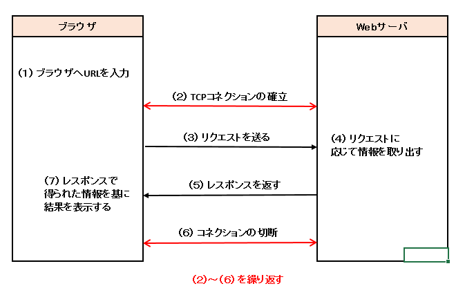 HTTPは、このクライアント(ブラウザ)とサーバー(Webサーバ)は、 (1)ブラウザへURLを入力 (2)スリーウェイハンドシェイクで、コネクションの確立 (3)クライアントからサーバーに「リクエスト(要請)」を送り (4)サーバーが必要な処理を行って (5)サーバーからクライアントに「レスポンス(返答)」を返す (6)コネクションの切断 という流れで通信の処理を進めます。HTTPでは、1回のやりとりで処理できる情報は1つに限られます。そのため、複数の情報を処理したいときは、この動作を複数回繰り返します。