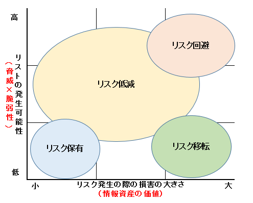 ●リスクアセスメントとは? 組織やシステムに内在するリストを特定し、その影響を知り、最も効果のある対策を講じること。これらは「リスク分析」「リスク評価」で実現します。 ●リスク分析 守るべき範囲の特定 ↓ 情報資産の洗い出し ↓ どのようなリストがあるのか特定する ●リスク評価 リスク分析から得られた情報を基にしてリスクの大きさを算出し、評価を行う。また、リスクが発生した時の「リスク対応」を決める。 ●リスク対応 1. リスク回避 リスクの発生要因を取り除き、リスクの発生を未然に防ぐ。 2. リスク転嫁 保険加入などの手段で、リスク発生時の対応責任を第三者へ移す。 3. リスク低減 リスク発生の確率や影響を低減させるための対策を講じる。 4. リスク保有 そのリスクのもつ影響力が小さいため、特にリスクを低減するためのセキュリティ対策を行わず、許容範囲内として受容すること。