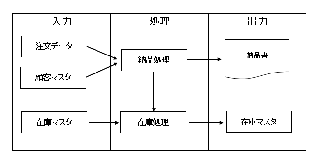 2. HIPO・プロセスフロー…処理の順序を明確にする。 ・HIPOは、階層構造を表す「図式目次」と、入力、処理、出力を表す「IPOダイアグラム」で表現します。 図式目次の例