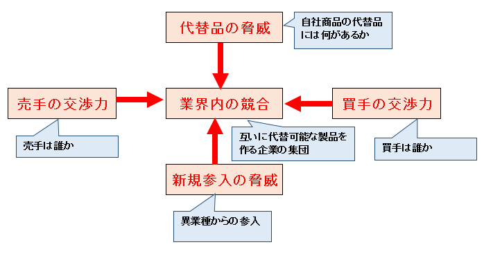 ● 製品内容(特徴):Product 2. 5F分析(ファイブフォース分析) 5つの視点から自社の戦略を検討する手法
