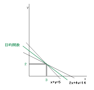 ●利益の合計 2x+3y(万円) これが「目的関数」 ●制約条件式 ・x+y <= 5 ・2x+4y <= 14 ・x >= 0, y >= 0 が制約条件式となります。 解の求め方はグラフを使用します。