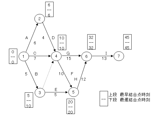 | ●最早結合点時刻 ある結合点から最も早く開始できる時刻です。複数の作業がある場合は「最も大きな値」を選びます。通常上段に記入。 ●最遅結合点時刻 これは後退計算と言い、PERT図の完了から差し引いていきます。この時複数の作業がある場合は「最も小さな値」を選びます。通常下段に記入。