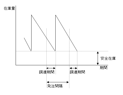 在庫管理の方法には以下の3種類があります。 ●定期発注方式 発注間隔をあらかじめ決めておき、発注日がくるたびに発注量を以下の式より求める方式です。 発注量=(発注間隔+調達期間)の需要推定値-現在の在庫量-発注残+安全在庫