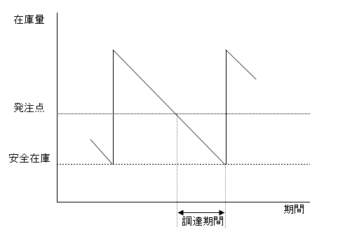 発注のたびに、需要予測などを行うためコストはかかるが厳密な在庫管理が可能で、ABC分析のA区分の在庫品に適用します。 ●発注点方式(定量発注方式) 在庫量が一定の水準まで減少したら、あらかじめ定めておいた発注量を機械的に発注する方法です。発注量は常に一定ですが、発注する時期は不定期となります。 発注点=調達期間中の平均消費量+安全在庫