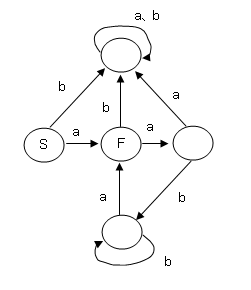 | 14 | 解答解説 | 次の有限オートマンで受理されるものはどれか。ただし、a、bは入力アルファベット、Sは開始状態、Fは受理状態とする。