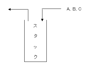 | 19 | ウ | 問題へ | スタックとは、LIFOの後入れ先出しのデータ構造です。つまり、一番最後に挿入されたデータが最初に取り出されます。 ●Aを挿入して他のデータを挿入する前にAを取り出す場合。 A-B-CとA-C-B ●Aを挿入後、他のデータの挿入・取り出しを行い、最後にAを取り出す場合。 B-C-AとC-B-A ●A、Bを挿入後、これらを取り出してから、Cを挿入して取り出す場合。 B-A-C 出力順序は以上の5種類となります。 |