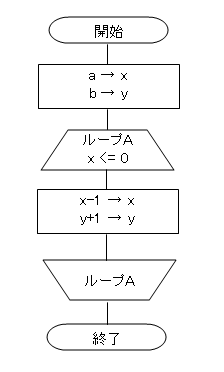 | 27 | ウ | 問題へ | この流れ図は、初期値として、xとyをセツトして、xが0以下になるまで、ループ処理を行い、その中で、xは-1ずつ減算して、yは+1ずつ加算しています。 例えば、a=10 b=15の時、この処理を実行すると、xとyの初期値はa bと等しいところからループ処理を行います。この中で、 xは、 9 8 7 6 5 4 3 2 1 0 yは、16 17 18 19 20 21 22 23 24 25 と変化していきます。(ここで、x+y=25が成立しています) a bは変化しないため、a+b=25です。 また、x+y=25となります。 よって、x+y=a+bという関係が成立します。 |