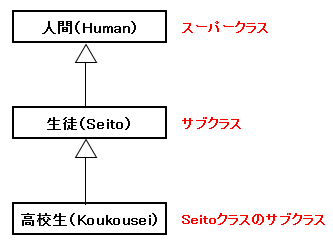 このようにあるクラスをもとにして新たなクラスを作成することを「継承」といいます。人間クラスを「スーパークラス」といい、生徒クラスを「サブクラス」と言います。また、高校生クラスのスーパークラスは、生徒クラスとなります。