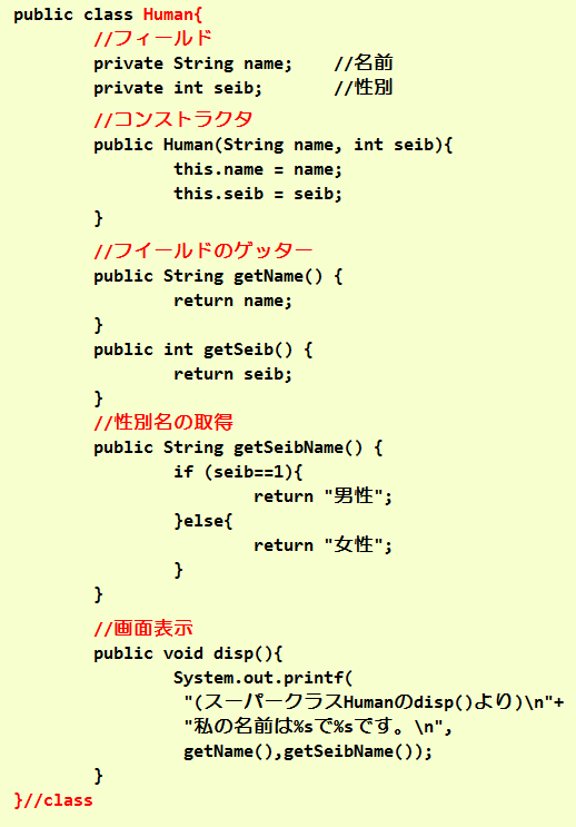 クラス「Human」の作成 このクラスは、フィールドに「名前」「性別」があり、メソッドとしてフィールドのゲッター及び画面表示メソッドがあります。
