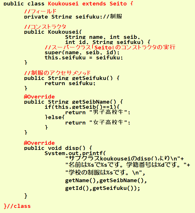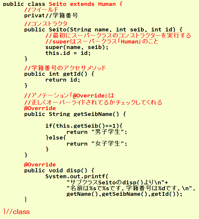 ここから継承です。Humanクラスをスーパークラスとする「Seito」クラスを作成します。生徒クラスには、フィールド「学籍番号」が追加されます。また、スーパークラスの画面表示メソッド「disp()」をオーバーライドします。