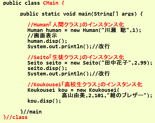 では、最後に、メインクラスで3つのクラスのインスタンス化をし、dispメソッドを呼び出しましよう。