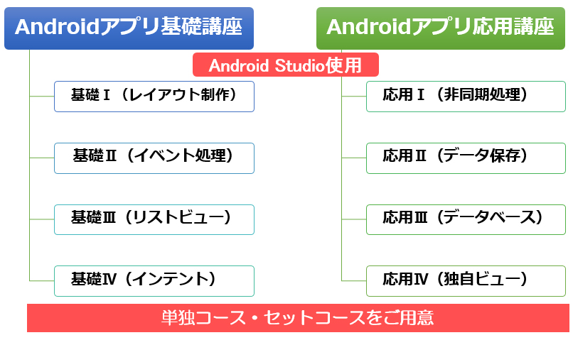 Androidアプリ開発講座は、以下の3種類の講座から構成されています。